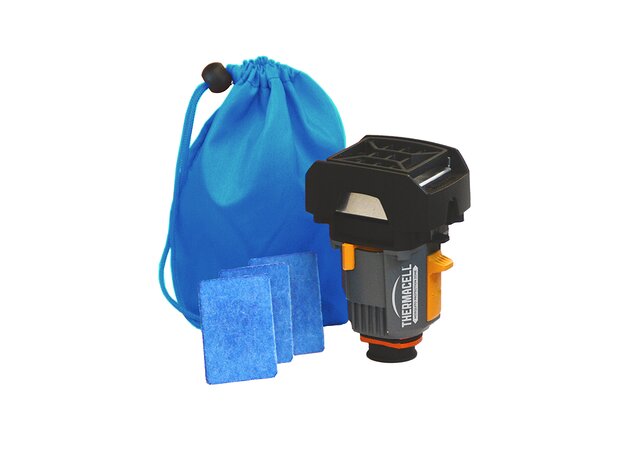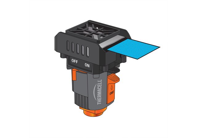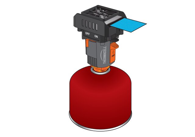 THERMACELL®-Wirkstoffplättchen aus der Schutzhülle nehmen und unter das Gitter einschieben. Campinggaskartusche einschrauben und Gerät einschalten. Ein Wirkstoffplättchen reicht für 4 Stunden. Die Packung enthält 3 Wirkstoffplättchen.